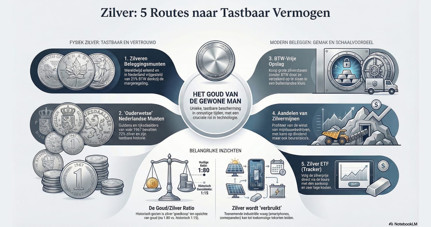 Of u nu kiest voor de nostalgie van de zilveren rijksdaalder, de glans van een nieuwe Canadese munt, of het gemak van opslag in Zwitserland: zilver blijft een tastbare manier om waarde vast te houden. Het geeft een veilig gevoel om iets achter de hand te hebben dat al duizenden jaren, in tijden van crisis en voorspoed, zijn waarde heeft bewezen.
