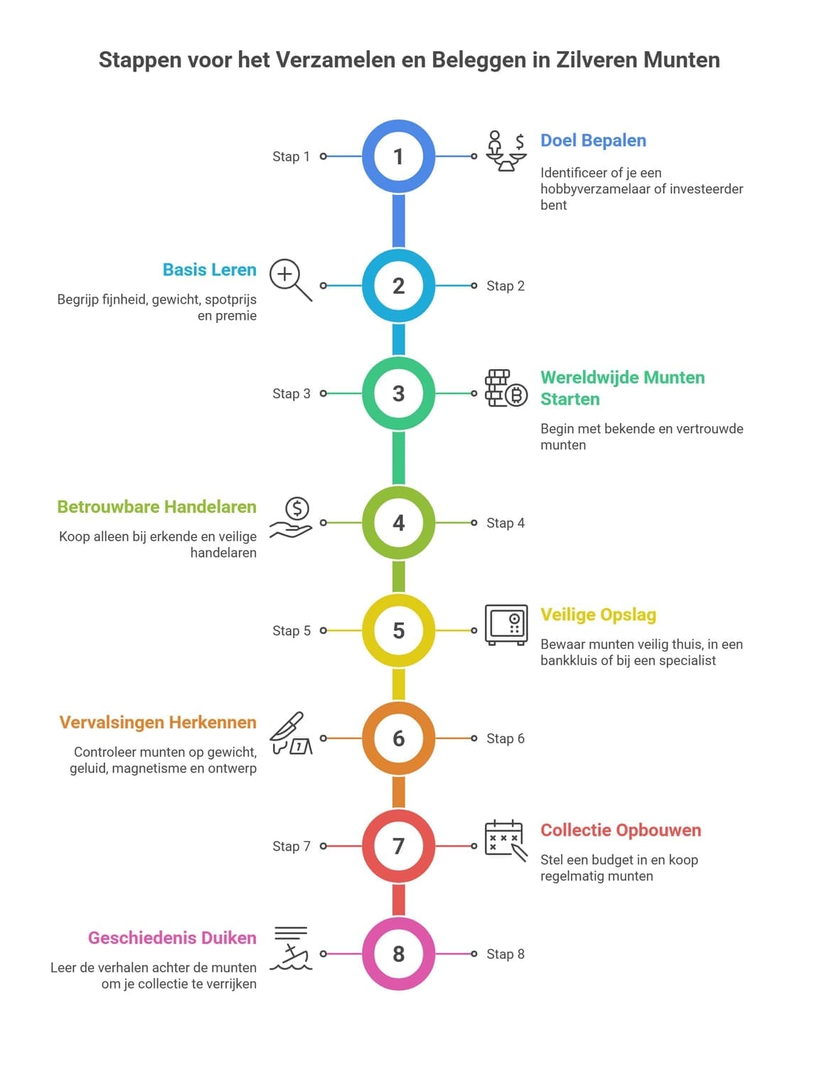 Haastige spoed is zelden goed. Stel een maandelijks budget in (bijvoorbeeld €50) en koop regelmatig een munt. Zo leer je de markt kennen en bouw je zonder druk een mooie verzameling op.