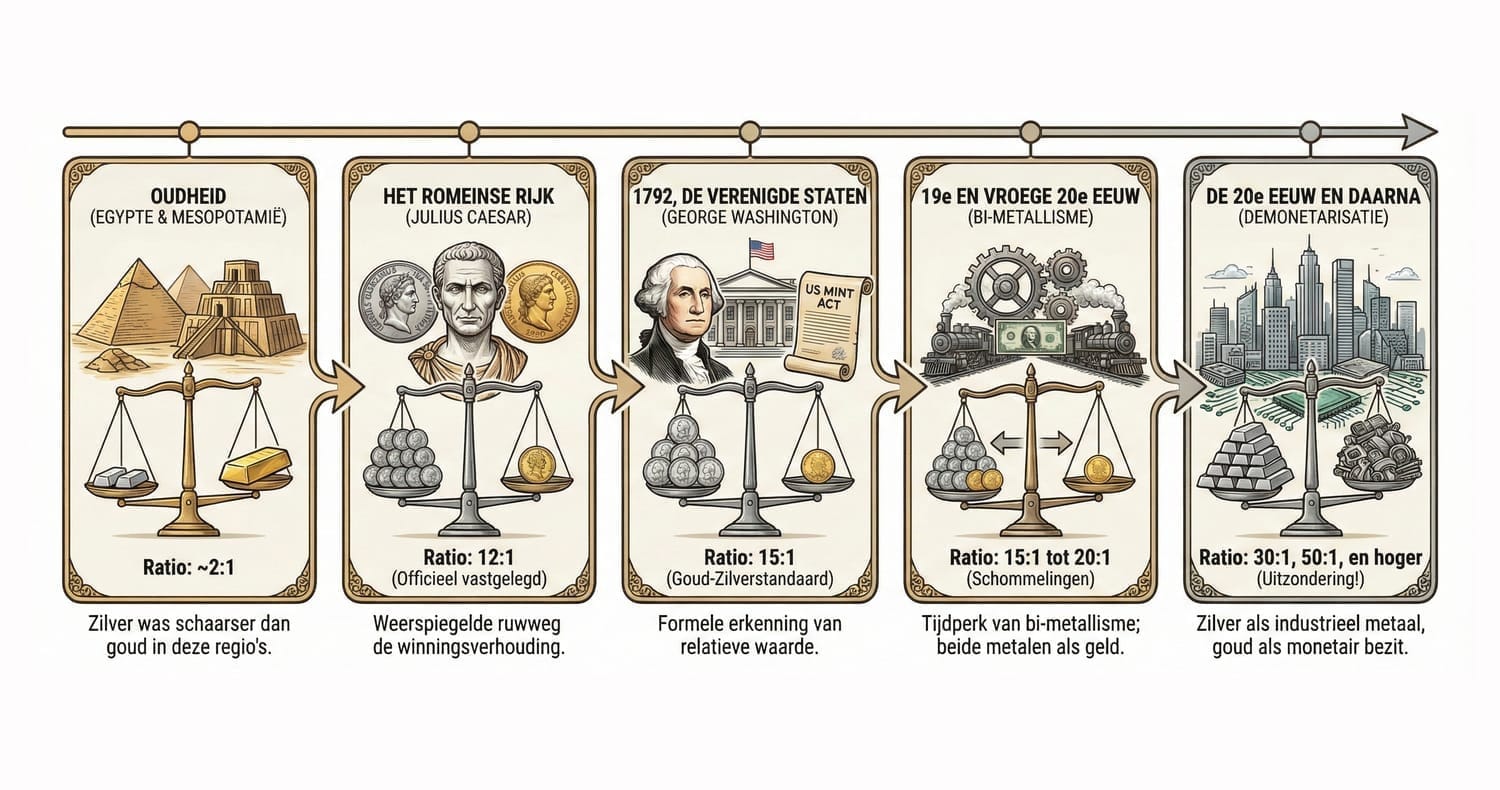 Oudheid: In het oude Egypte en Mesopotamië werd de ratio vaak rond de 2:1 vastgesteld, simpelweg omdat zilver schaarser was dan goud in die regio's.
