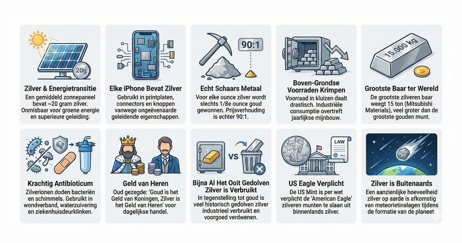 Bijna Al het Ooit Gedolven Zilver is Verbruikt: In tegenstelling tot goud, waarvan bijna al het goud dat ooit is gedolven nog steeds bestaat (in kluizen of als sieraad), is een groot deel van het historisch gedolven zilver verbruikt in industriële toepassingen en weggegooid. Het is voorgoed verdwenen.