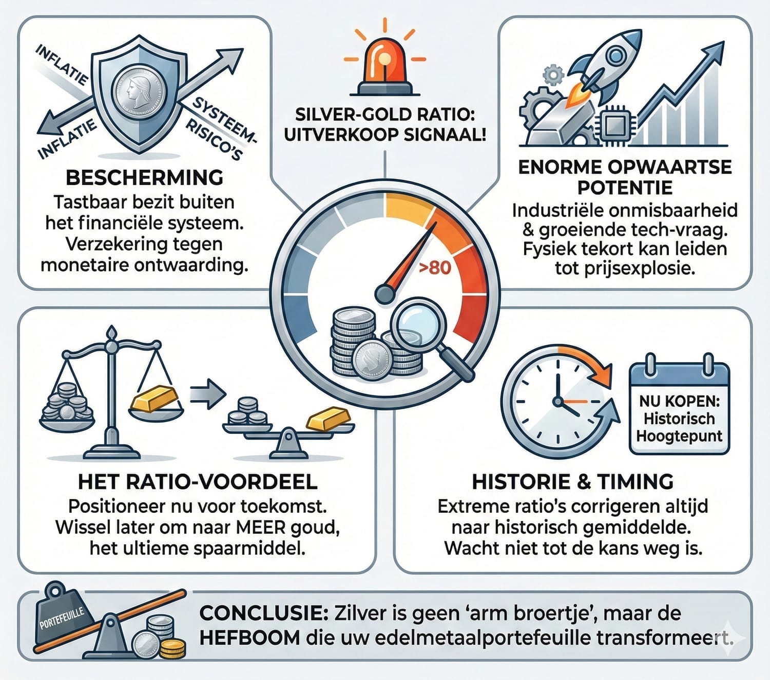 Het Ratio-Voordeel: Door nu zilver te kopen, positioneert u zichzelf om in de toekomst, tegen een veel gunstigere verhouding, uw zilver om te wisselen naar goud. U vergroot uw vermogen in termen van goud, het ultieme spaarmiddel.